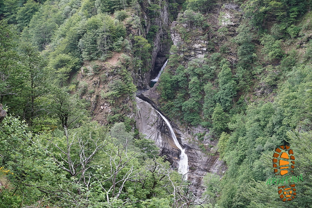 In seguito, visto che le gambe hanno reagito bene ai primi 1’300m di dislivello, valutiamo di poter “digerire” facilmente un altro po’ di salita. Decidiamo quindi di rientrare a Lodano compiendo un giro ad anello che ci fa transitare, sempre su sentieri segnalati alla perfezione, dagli alpeggi di Nagairóm e Casgèira. Superato quest’ultimo alpe, il zig-zagante sentiero nel bosco, ci porta sempre più in basso verso le belle cascine di Castel, costruite rigorosamente in pietra e affacciate sul Rio di Lodano. A questo punto scegliamo di non attraversare il fiume, ma di mantenerci sulla sua sponda sinistra, così facendo ci tocca salire ancora di qualche metro fino a Canigèe per poi scendere direttamente verso la frazione Ronchi, dove abbiamo parcheggiato. Restando su questo lato riusciamo a scorgere delle belle cascate a scivolo che scendono nel versante opposto della Valle di Lodano. Questa è l’unica parte dell’escursione classificabile con difficoltà T3 (alcune cordine e qualche passaggio un po’esposto), a giudicare dall’erba alta e dalle felci che crescono sul sentiero si direbbe che la tratta da Canigèe a Lodano sia meno utilizzata, ma sottolineo che il sentiero è comunque segnalato.