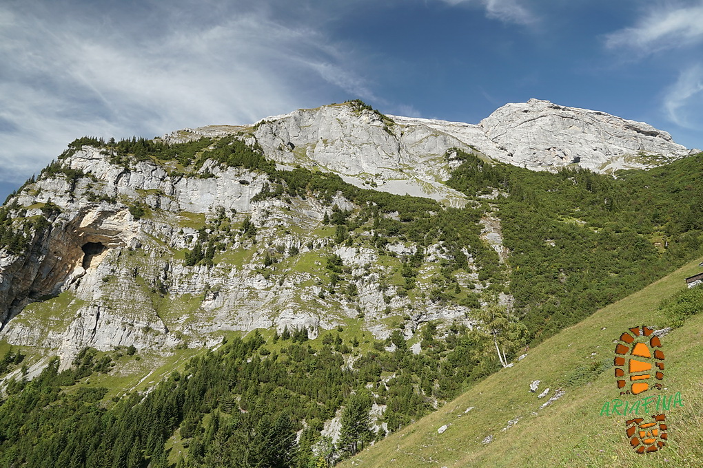 La zona è caratterizzata da magnifiche formazioni rocciose grigio-argentate che vagamente ricordano un po’le Dolomiti. Ed è proprio in una di queste pareti di roccia, più precisamente in località Ofenloch (che tradotto dal tedesco significa “foro del forno” ma presumo che “ofen” sia un termine dialettale per “offen” e in tal caso la definizione diventerebbe “buco aperto”, cascando proprio a pennello), che si apre un’enorme grotta che assomiglia molto a una Batcaverna, peccato non avere un drone per andare a curiosare.