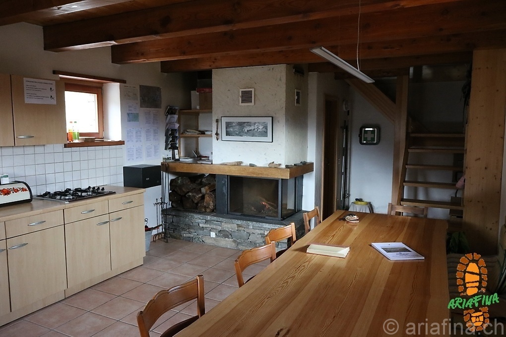 Dopo due ore e mezza arriviamo alla Capanna Alp da Canaa che già da fuori si presenta bene, la struttura tutta in pietra è ben inserita nel paesaggio. Purtroppo la giornata non è molto soleggiata e le foto risultano un po’ spente. Entriamo quindi in capanna per dare un’occhiata agli interni e fare pic-nic al caldo.