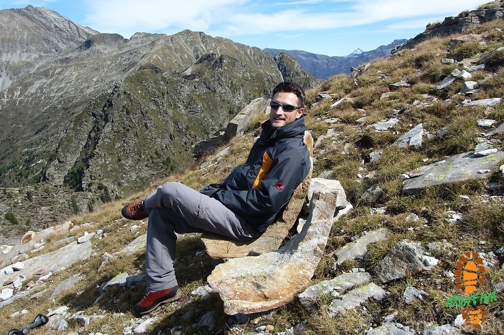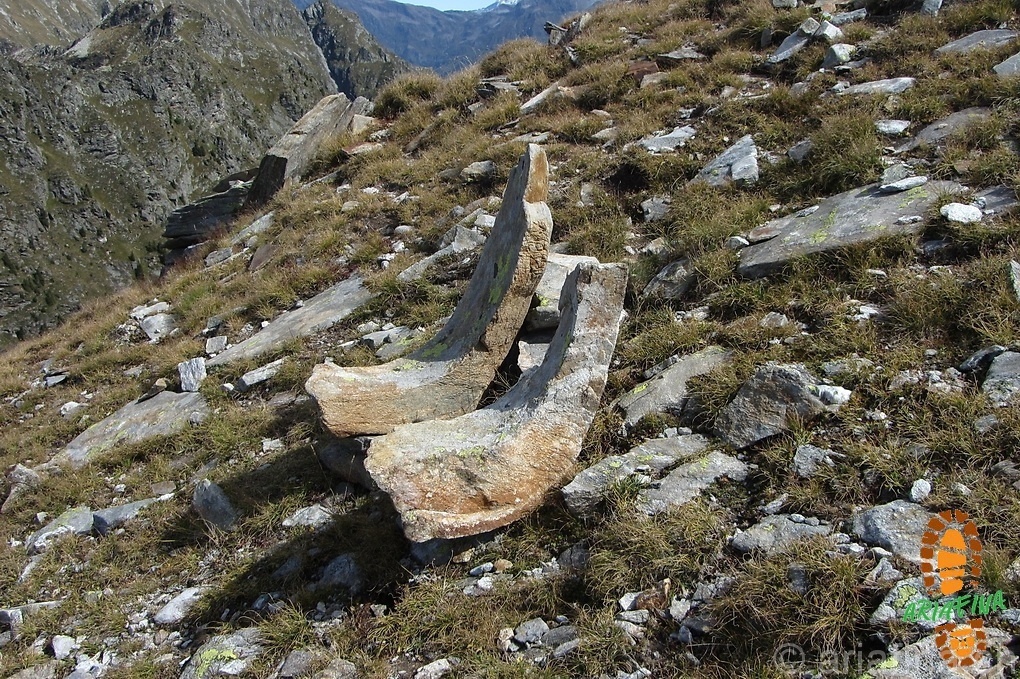 Purtroppo tira un ventaccio gelido così la permanenza non è delle più gradevoli, scattate le foto e mangiucchiato qualcosa ritorniamo sui nostri passi. Poco prima di arrivare al Pass de Buffalora ci imbattiamo in due pietre che assomigliano molto a delle poltrone, le proviamo e non sono niente male! Starebbero proprio bene fuori dalla cascina, ma portarsele via non è cosa semplice…