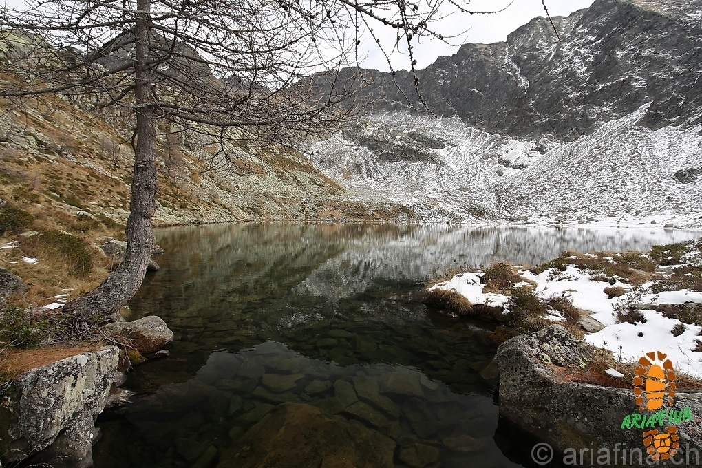 I larici, complice il forte vento dei giorni scorsi, hanno perso quasi tutti gli aghi e sono abbastanza spogli, la zona attorno è leggermente imbiancata dalla neve caduta nella notte e quindi per finire la visione odierna non è molto diversa da quella della volta prima!