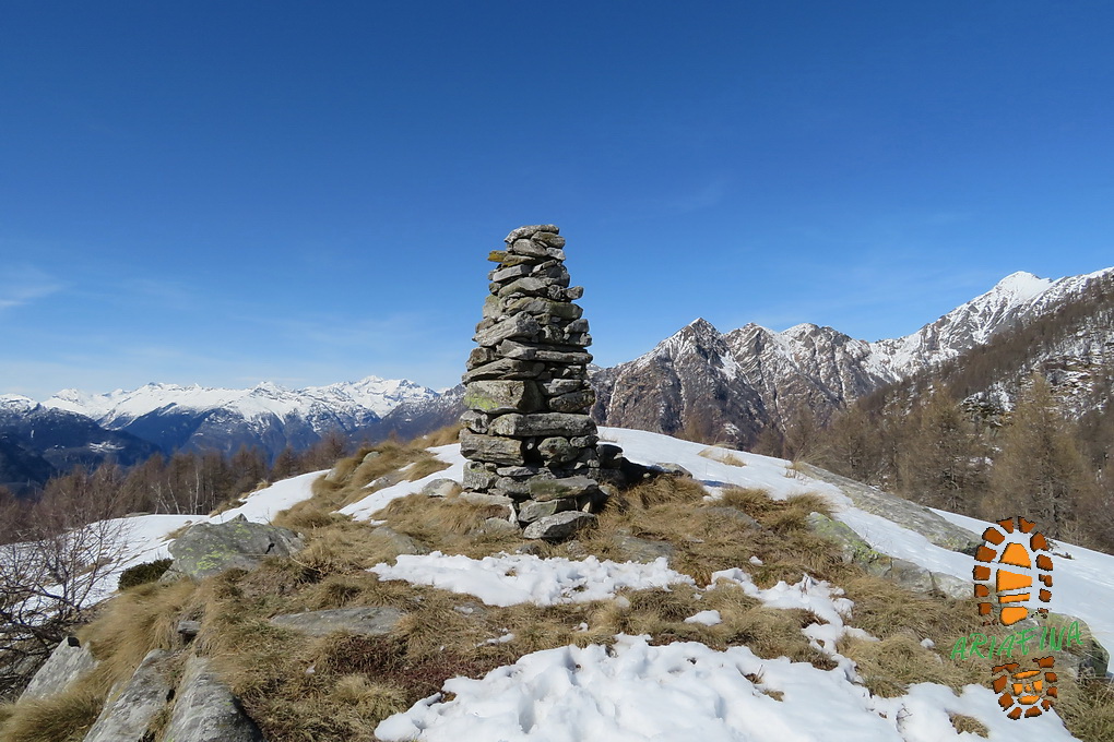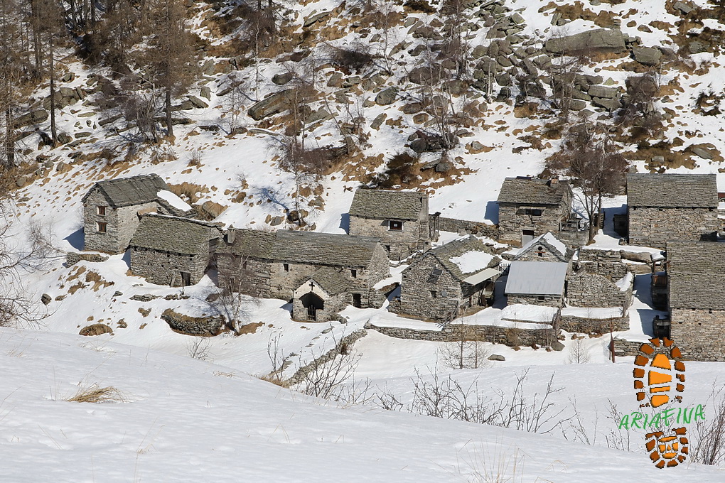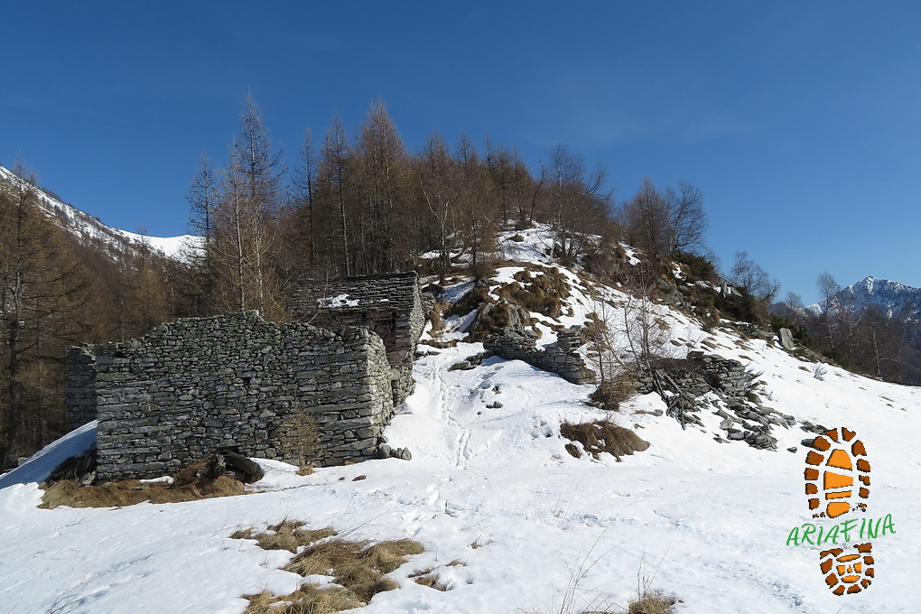 Mauro m’informa che mancano circa 300 metri di dislivello in salita e che la pendenza nell’ultimo tratto dovrebbe diminuire. Nei dintorni delle prime cascine di Aiarlo, faggi e betulle lasciano spazio ai larici e di colpo ci troviamo a fare i conti con un buon 40 centimetri di neve marcia apparsa magicamente dal nulla. Va da sé che la parte terminale di salita ci fa penare parecchio con continui sprofondamenti fino al ginocchio! Dopo tre ore raggiungiamo il grande gendarme di pietra sulla Còsta di Pèpa a quota 1’524m, promontorio panoramico affacciato sulla Valmaggia e sul bellissimo nucleo di cascine di Aiarlo di Dentro. Non sono in grado di dire se il nome “Còsta di Pèpa” derivi da vecchie versioni di cartine topografiche, attualmente la CN non riporta alcun nome specifico per la quota 1524m, anche in questo caso prendo spunto da chi ci ha preceduti.
