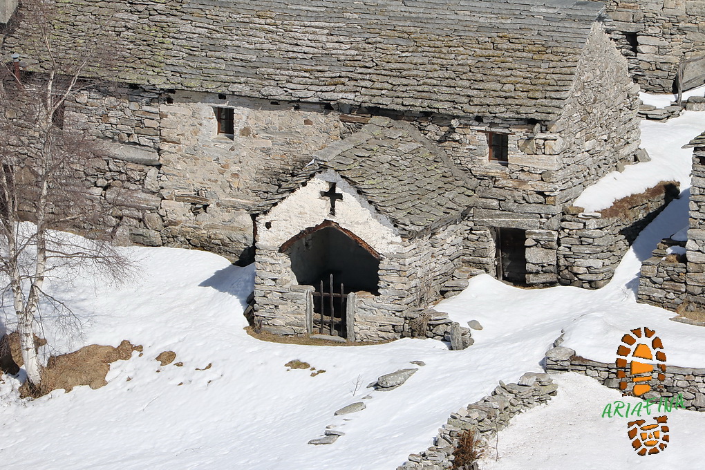Le valli del Locarnese ci hanno abituato negli anni a sentieri fatti di scalini e quello per Aiarlo non fa eccezione. Dopo esserci lasciati le case del paese alle spalle imbocchiamo la prima scalinata che ci porta alla Capèla dala Piòda a quota 476m. Da questo punto panoramico la vista spazia sul paese di Maggia, ci soffermiamo qualche istante per ammirare i dipinti e poi riprendiamo la salita verso la Valle del Salto.