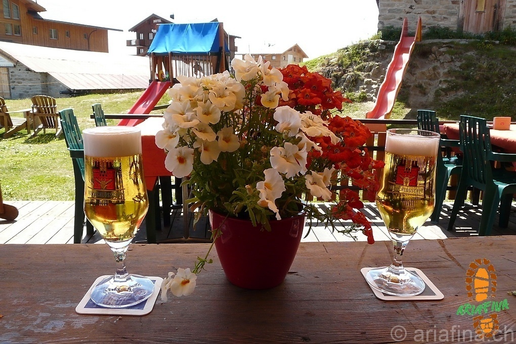 Arrivati all’alpe abbiamo infilato le gambe sotto al tavolo per una birra fresca (la canicola si è fatta sentire a tutte le quote anche oggi) e mezz’oretta più tardi abbiamo ripreso la funivia che ci a portati nuovamente a Fiesch…tutto facilissimo.