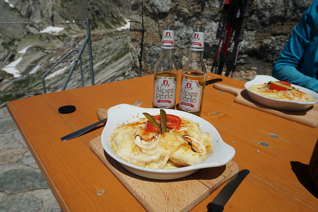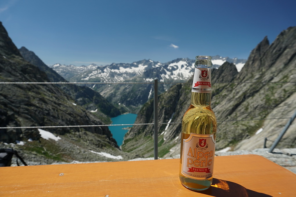 Dopo i primi 40 minuti di salita raggiungiamo le rive del Gelmersee, grazie alla stupenda giornata il paesaggio è magnifico e le acque del lago si mostrano di un bellissimo color turchese da cartolina! Decidiamo per motivi di esposizione al sole di compiere il giro del lago seguendo dapprima la sponda destra (sud) e di rientrare al pomeriggio passando per quella opposta. Scelta azzeccata, mentre percorriamo la riva siamo costretti a frequenti pause fotografiche per immortalare lo stupendo paesaggio! Giunti in fondo al lago attraversiamo una stretta passerella attaccata a una parete rocciosa e poco dopo raggiungiamo quota 1884m dove si trova l’imbocco della valletta e del sentiero che porta alla Gelmerhütte. Sopra le nostre teste troneggiano enormi pareti di granito e se il paesaggio di ieri mi ricordava l’Islanda, oggi la sensazione è quella di trovarmi nel Yosemite National Park in California. Nella valle scorre un riale che visto il periodo butta un sacco d’acqua e forma scenografiche cascate a scivolo. Da qui ricomincia la salita, sul percorso c’è moltissima gente e sentiamo parlare spesso inglese, segno che la Gelmerhütte è una destinazione turistica. Notiamo subito che il sentiero è davvero ben fatto con i sassi posizionati alla perfezione a formare una lunga fila di gradini. La salita è un po’sofferta a causa del gran caldo ma dopo tre ore arriviamo alla Gelmerhütte, capanna del CAS sezione Brugg. La struttura domina la vallata e il panorama dalla terrazza è bellissimo, impossibile non notare il Gelmersee in basso e il suo colore turchese. Ci accomodiamo a un tavolo esterno insieme ad altri avventori e…pancia mia fatti capanna…ordiniamo due Käseschnitte e due birre. Oggi nessuna delusione, il pranzo è delizioso e anche i rösti che vediamo arrivare sui tavoli vicini sembrano appetitosi e soprattutto fatti in casa! W la Gelmerhütte! Paghiamo il conto, che per assurdo è più basso di quello di ieri, e dopo un ultimo reportage fotografico torniamo sui nostri passi. Discesa per la stessa via di salita, salvo il tratto che costeggia il Gelmersee che come già deciso la mattina compiamo seguendo la sponda opposta.