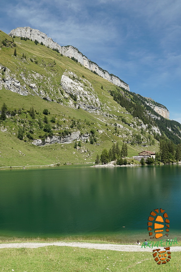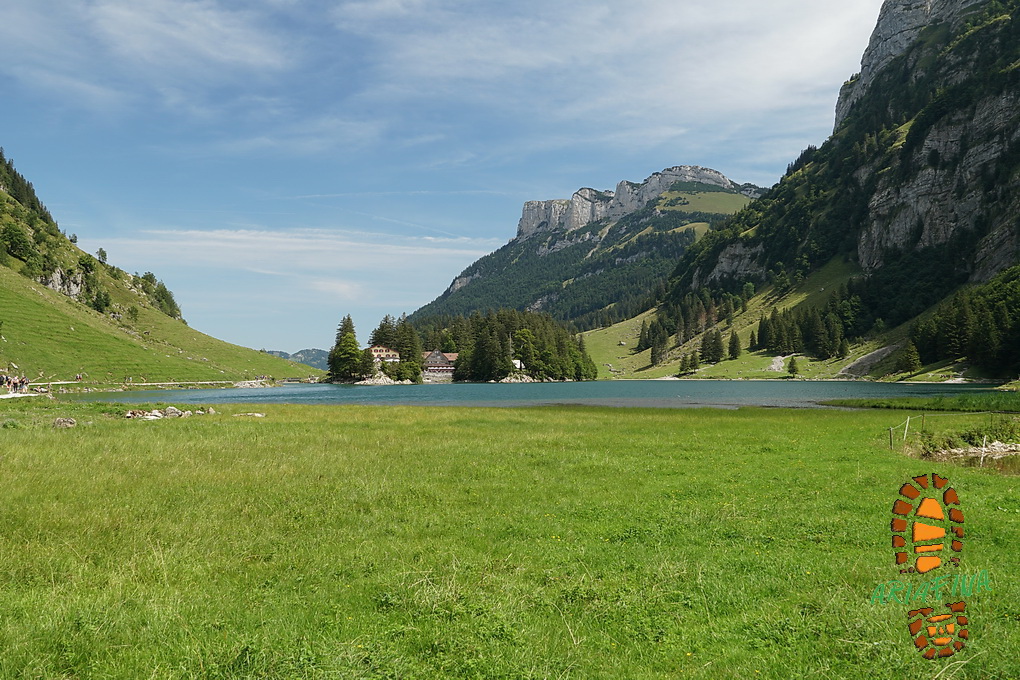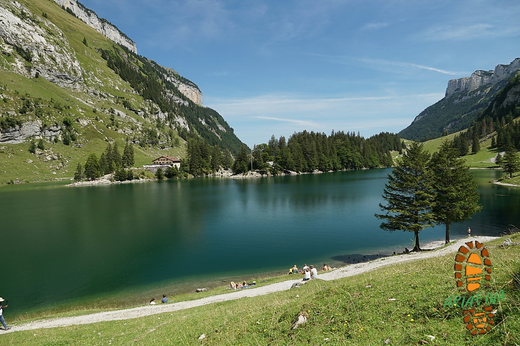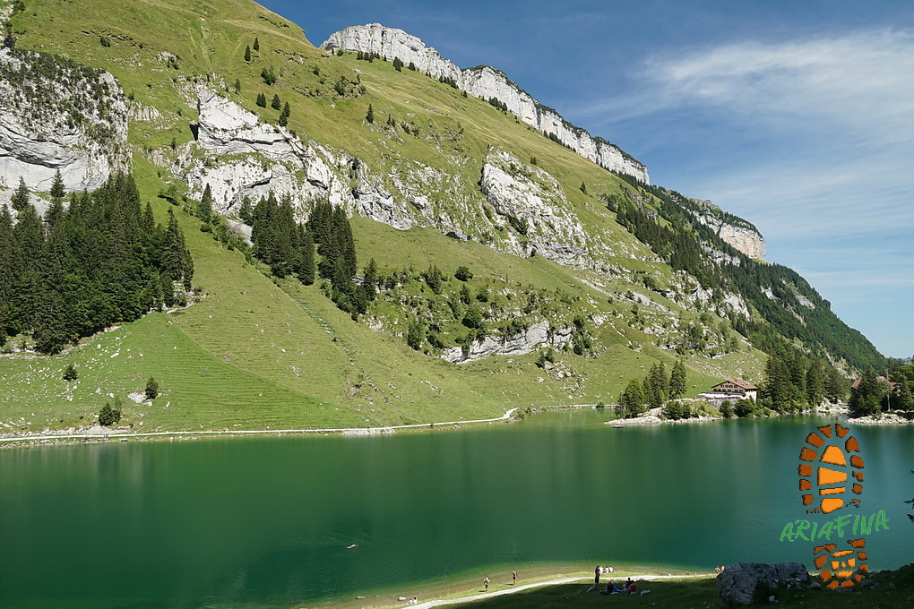 Dall’alpeggio ripercorriamo il sentiero a ritroso fino a quota 1’492m e da lì seguendo le indicazioni scendiamo al Seealpsee con un percorso piuttosto ripido e sdrucciolevole che passa sotto delle impressionanti pareti di roccia, la vista dall’alto sul lago è davvero incredibile.