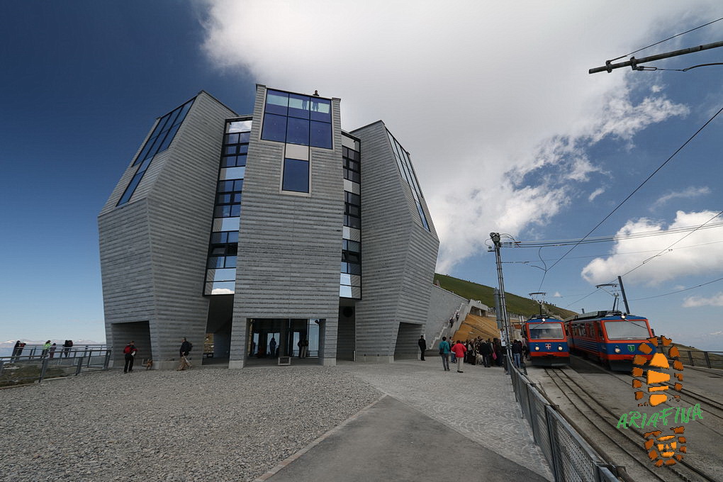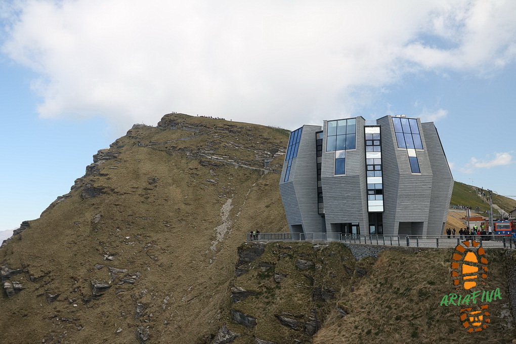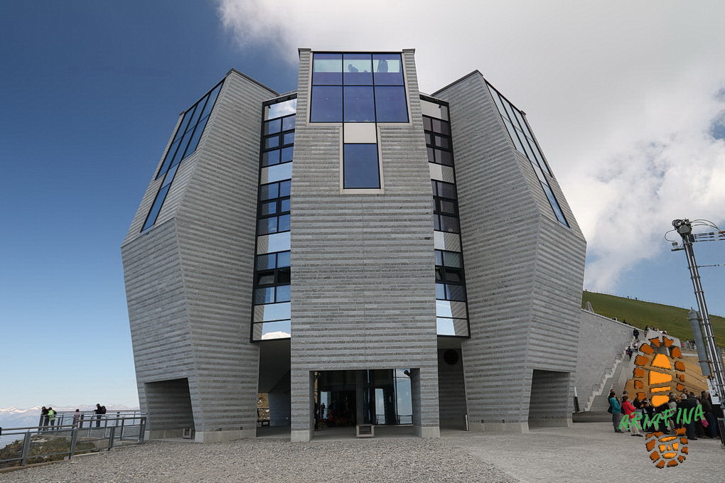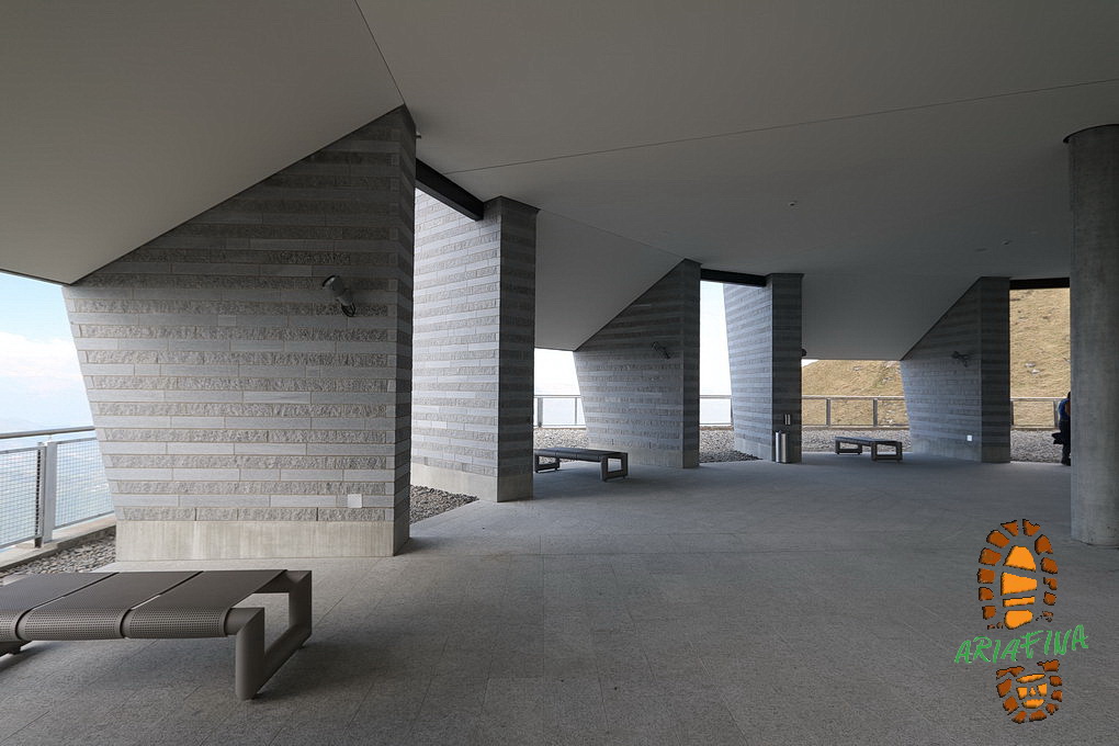 Per ultimo abbiamo raggiunto il Fiore di Pietra dell’Arch. Botta nel quale siamo entrati per visionare i due ristoranti e osservare il panorama dalla grande terrazza sul tetto. Beh che dire? Piace o non piace. L’interno è molto cemento armato ma la struttura all’esterno è interamente rivestita di pietra e le grandi vetrate a specchio che riflettono il cielo rendono la visione d’insieme affascinante, quindi in conclusione direi che a noi è piaciuto.