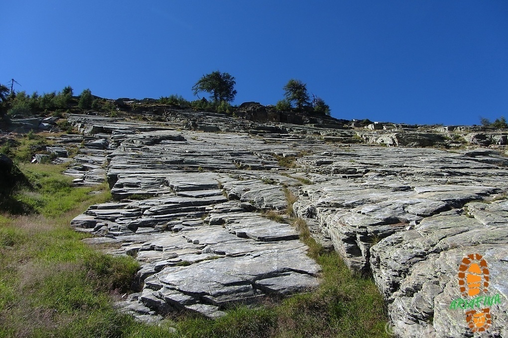 Per finire ravanando un po’qua e un po’là (dopo un inutile giro per l’Alpe Sgiopa e le Ganne d’Airòld) arriviamo ai piedi della grande placca di roccia che si vedeva già benissimo dal sentiero mentre ci stavamo avvicinando.