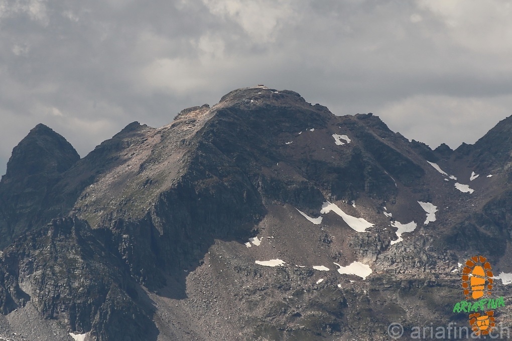 Guardando in Val di Blenio ci troviamo davanti la Cima del Simano, la Cima di Gana Bianca, l’Adula…altri bei ricordi. Pappata l’insalata di pasta e scattate le foto decidiamo di scendere, perché tira un’arietta veramente gelida e senza sole il freddo è a dir poco pungente, altro che estate!