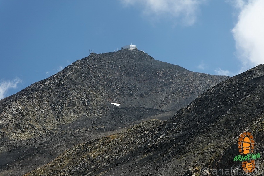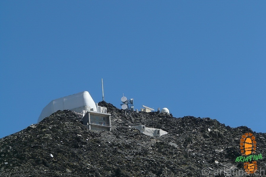 Sullo Scopi ci sono degli operai che stanno lavorando e sentiamo un profumino di cucina arrivare da uno dei bunker sottostanti. La piccola teleferica di servizio che arriva fino alla vetta va su e giù e durante tutto l’arco della giornata sentiamo purtroppo un elicottero che fa avanti e indietro per trasportare materiale nei dintorni della stazione a valle della funivia. Quando si dice “la pace in montagna”! Dal lato “stereofonico” la giornata non è stata molto rilassante.